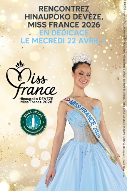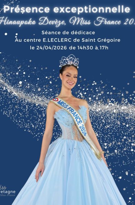 Retrouvez Hinaupoko DEVÈZE, Miss France 2026 en séance de dédicace le vendredi 24 avril, de 14h30 à 17h au Centre E.LECLERC de Saint Grégoire (Îlle-et-Vilaine – 35).