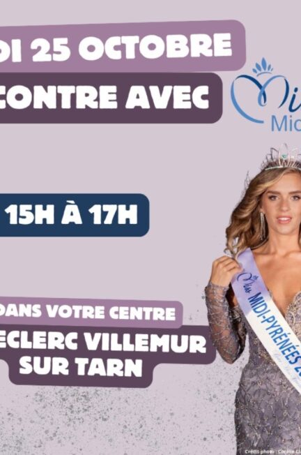 Retrouvez Léa CHABREL, Miss Midi-Pyrénées 2025 en séance dédicace le samedi 25 octobre de 15h à 17h au centre Leclerc de Villemur sur Tarn (Haute-Garonne – 31).
