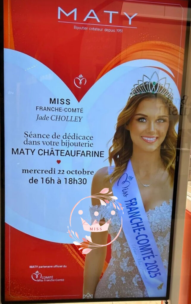 Retrouvez Jade CHOLLEY, Miss Franche-Comté 2025 en séance dédicace le mercredi 22 octobre de 16h à 18h30 à la bijouterie Maty de Châteaufarine (Doubs – 25).