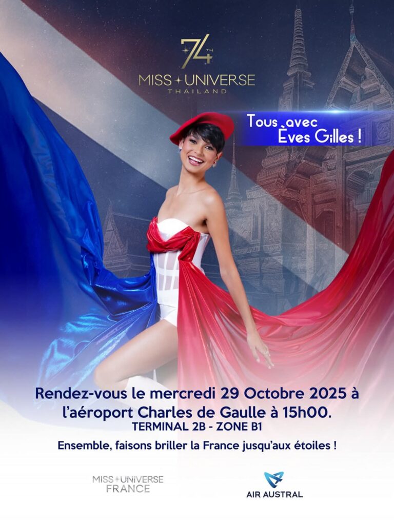Si vous avez envie de soutenir Ève GILLES, Miss France 2024 avant son départ pour la Thaïlande, rendez-vous le mercredi 29 octobre à 15h à l’Aéroport Charles De Gaulle, Terminal 2B , Zone B1.