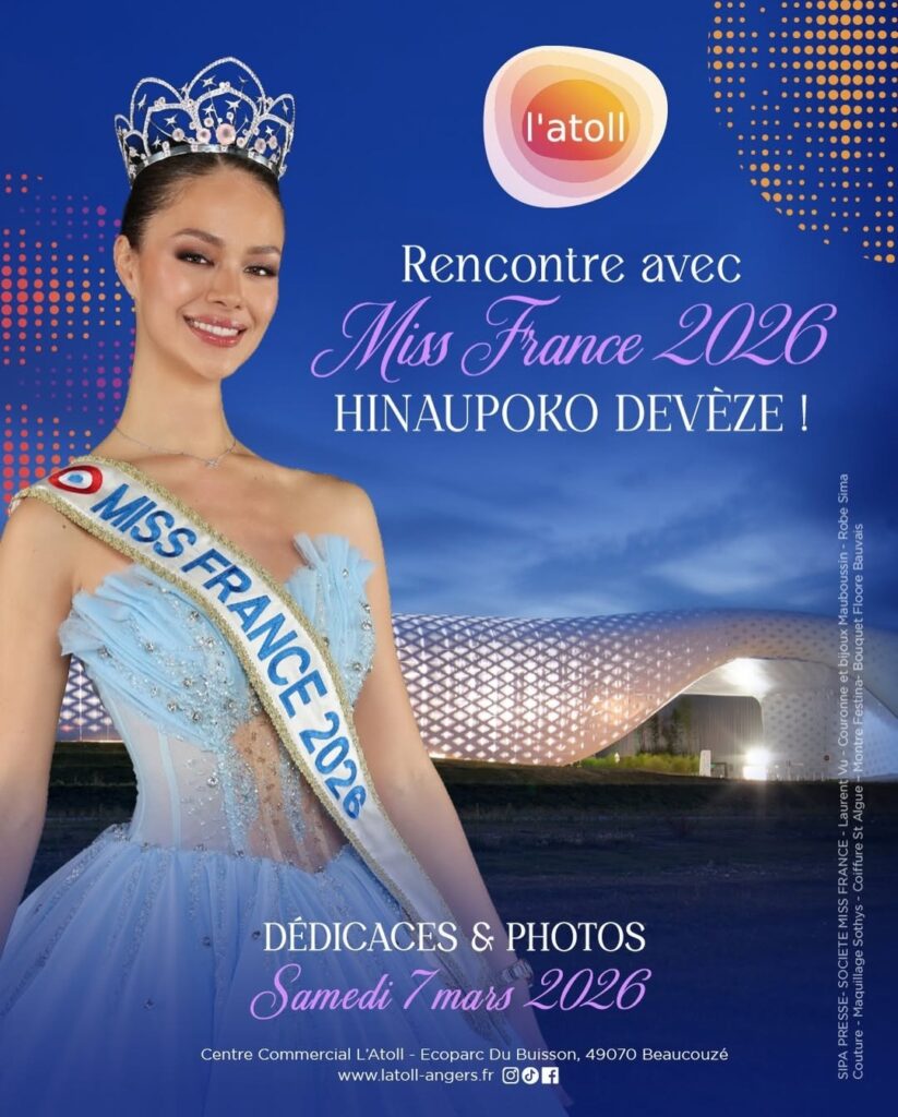 Retrouvez Hinaupoko DEVÈZE, Miss France 2026 en séance de dédicace le samedi 07 mars, de 15h à 17h30 à la Maison de l’Atoll (Maine et Loire – 49).